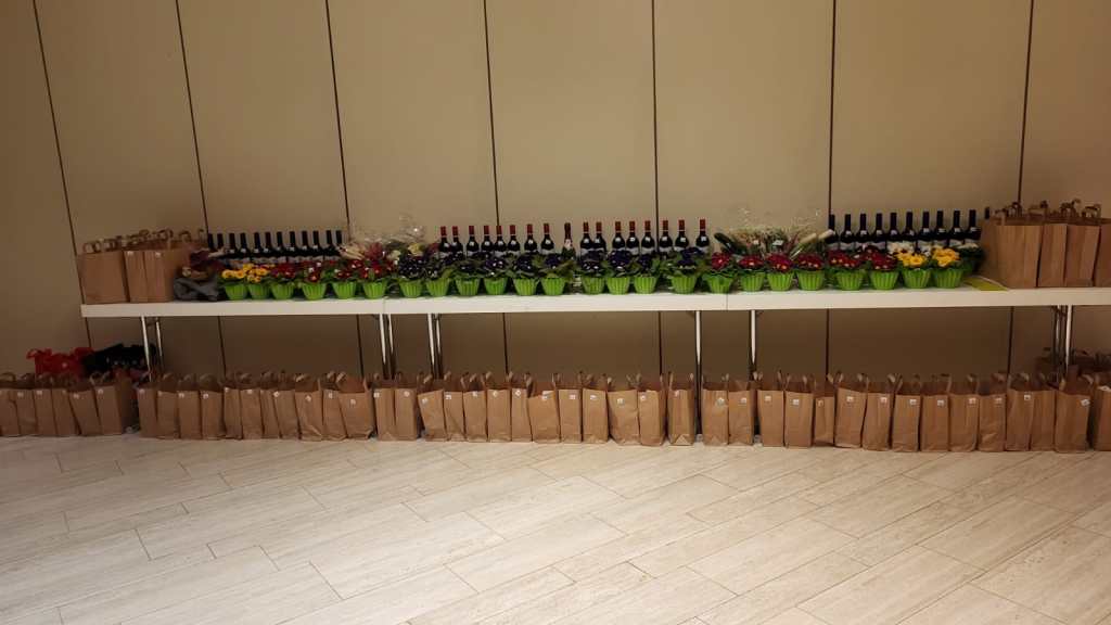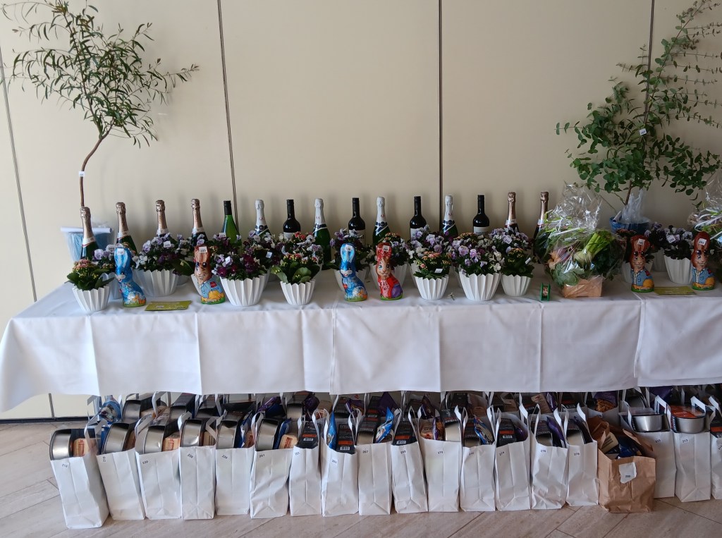 Hauptversammlung 31.3.23 Ehrenmitglied Arthur Schöneck mit den 2 Vorständen und aufgebauter Tombola
