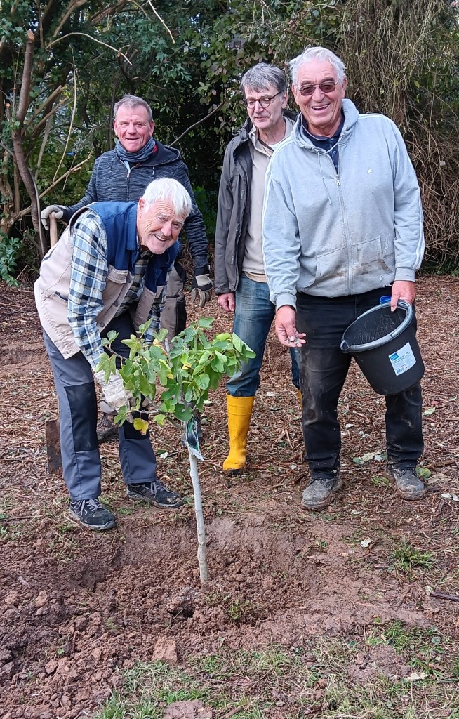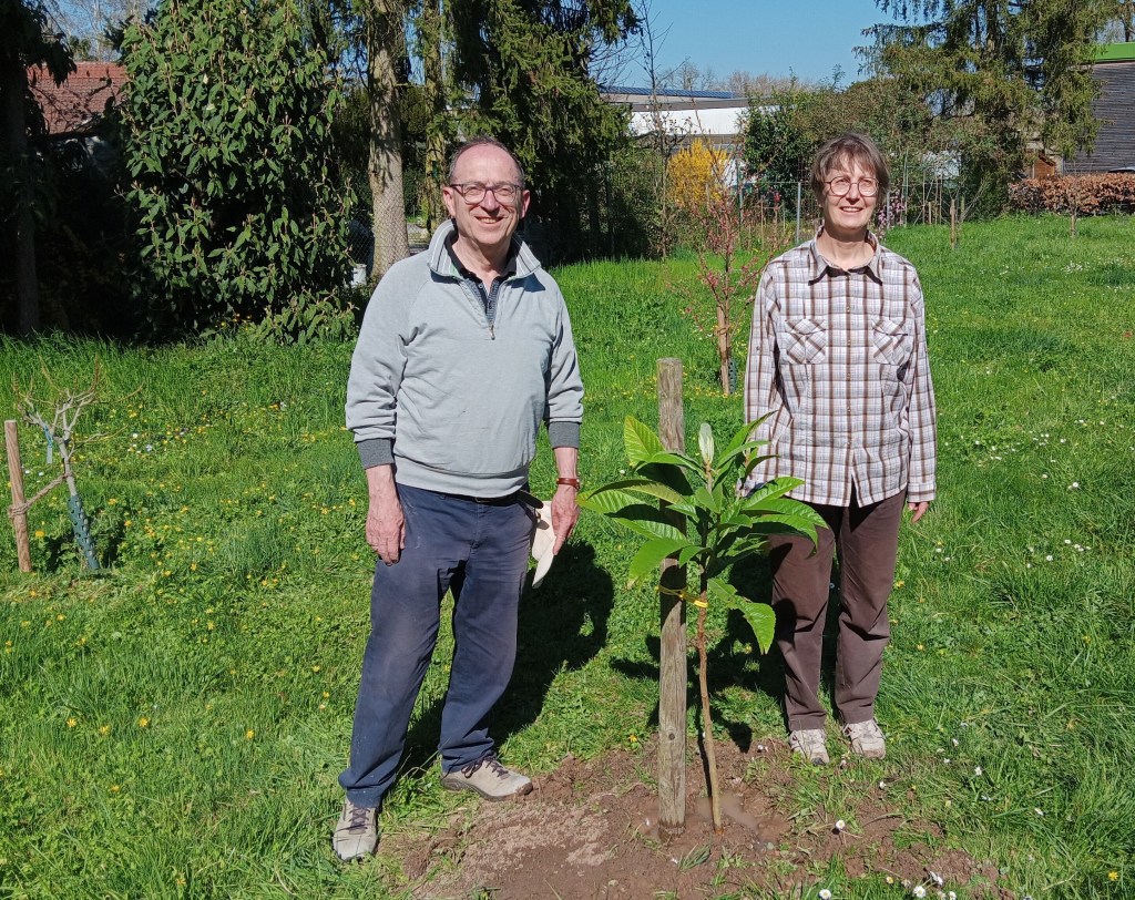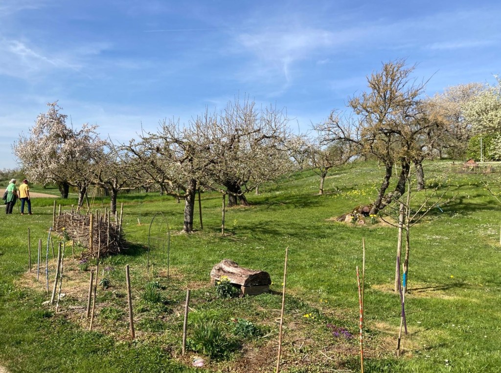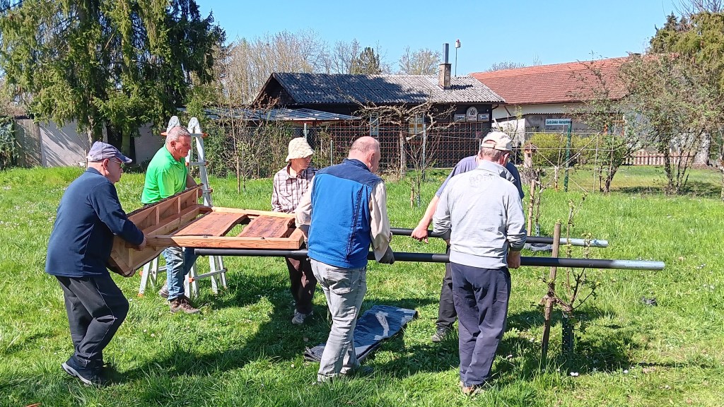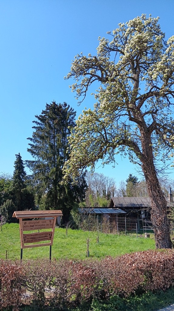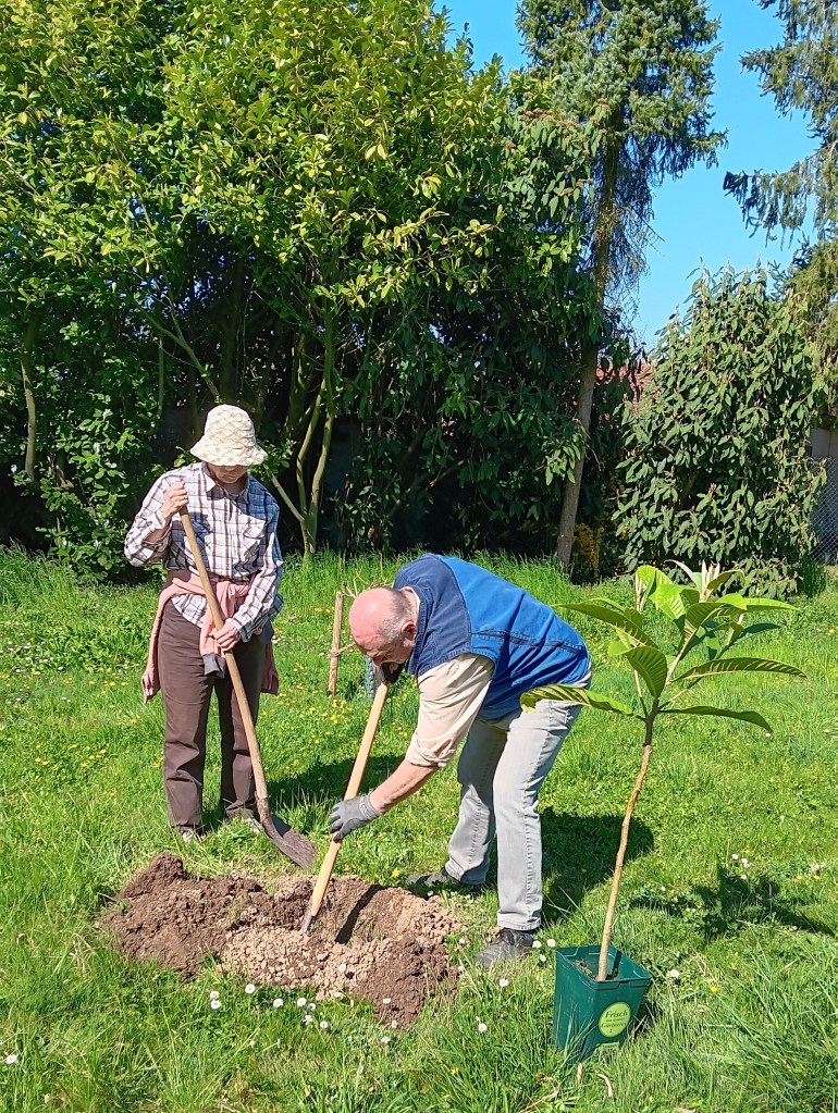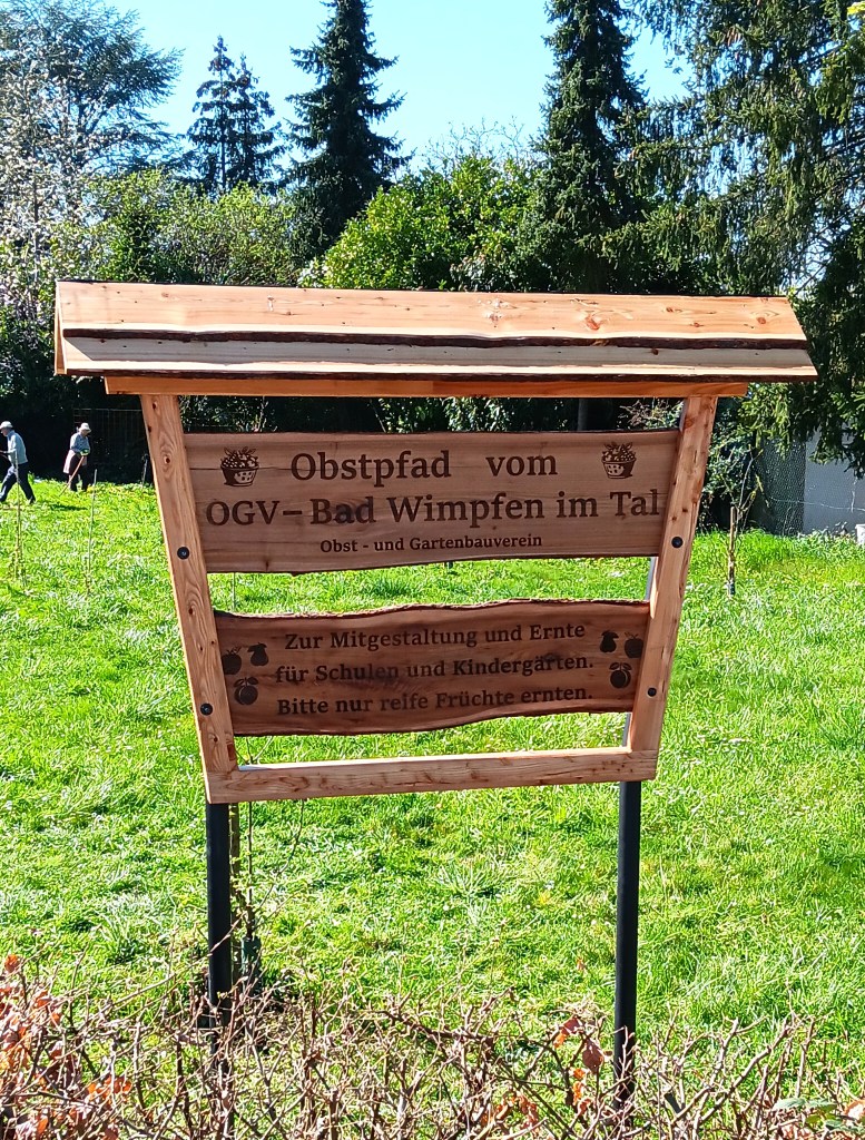 4. April Am Obstpfad Vereinsschild zusammengebaut und gestellt. Japanische Wollmispel gesetzt die von Stefan Szczes gestiftet wurde.