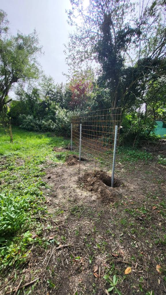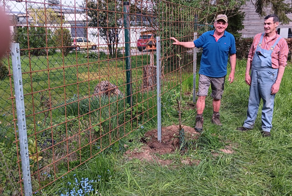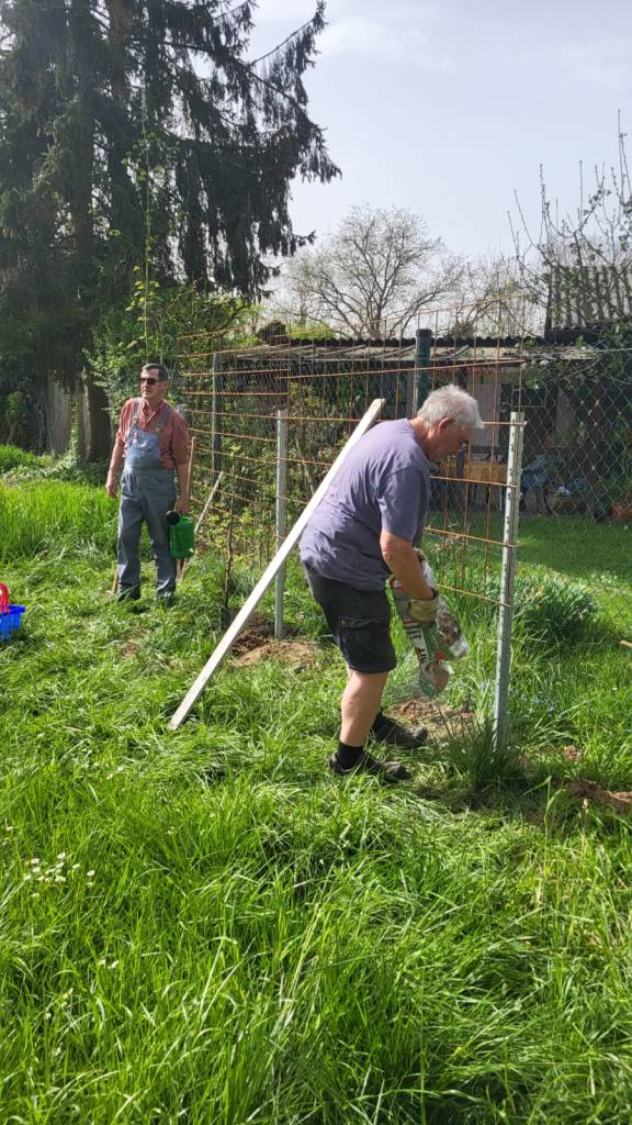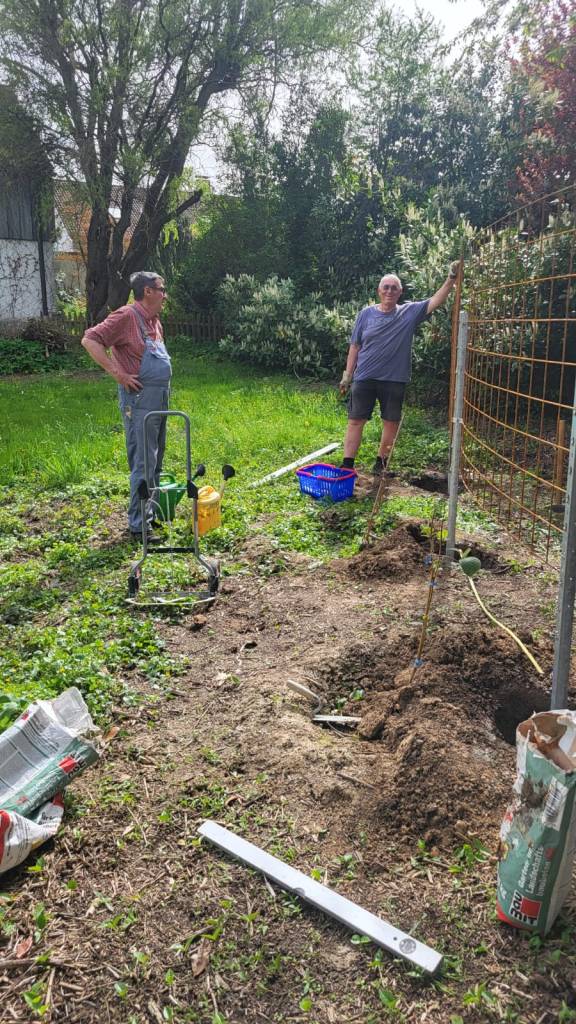 08. April 2024 am Obstpfad Pfosten und Stahlgitter für 2 Spaliere von 3 Mitgliedern betoniert und angebracht.