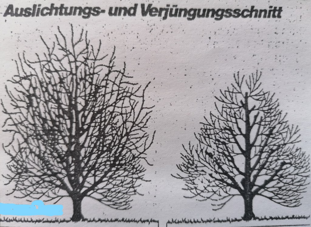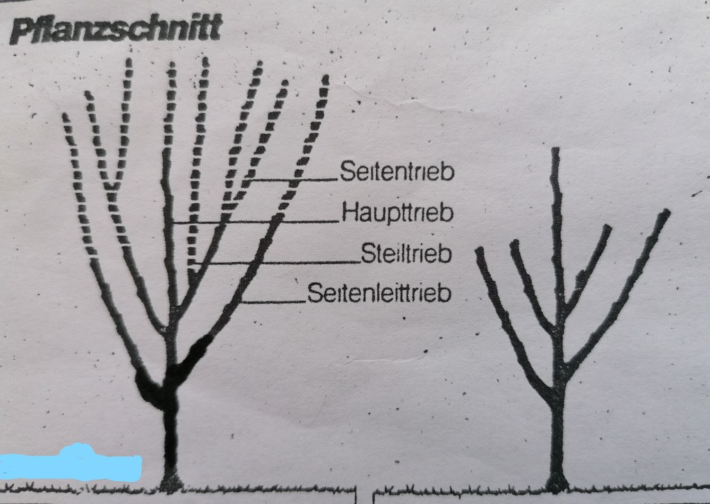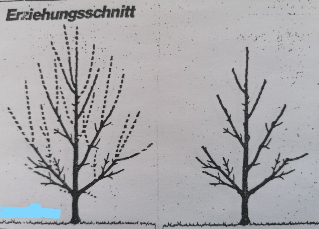 Für den Pflanzschnitt sucht man sich zuerst die Seitentriebe aus, die etwa in einem Winkel von 45° zum Mitteltrieb stehen. Diese werden auf 2 Drittel ihrer Länge auf ein nach außen stehendes Auge (Knospe) zurückgeschnitten. Danach wird der Mitteltrieb um 15 bis 20 Zentimeter über dem Anschnitt der Seitenleittriebe beschnitten. Die sogenannten Steiltriebe werden vollkommen entfernt.Der Erziehungsschnitt dient zur Entwicklung der Krone und wird vom 2. bis zum 5. Standjahr durchgeführt. Hierbei werden die Seitenleittriebe jährlich um ein Drittel der Trieblänge zurückgeschnitten. Die Steiltriebe werden wiederum völlig entfernt. Das gleiche gilt für den direkt am Haupttrieb auftretenden Konkurrenztrieb. Der Haupttrieb wird während des Erziehungsschnitts nur so weit zurückgeschnitten, dass er immer noch höher und somit dominierender bleibt als die Seitentriebe. Als Grundregel für den Erziehungsschnitt gilt: Haupttrieb, Konkurrenztrieb und Seitentrieb werden geschnitten. Alle anderen Triebe schneidet man nicht.Dieser verjüngt den Baum und sorgt für eine ausreichende Lichtzufuhr im inneren des Baumes. Denn auch die unteren Knospenpartien benötigen viel Licht., damit sich die Triebe, Blätter und Früchte entwickeln können und eine Verkahlung der unteren Äste durch Lichtmangel vermieden wird. Man erreicht das durch Herausschneiden ganzer Äste und Astteile. Ausgelichtet werden Steiltriebe, Konkurrenztriebe und Seitentriebe.